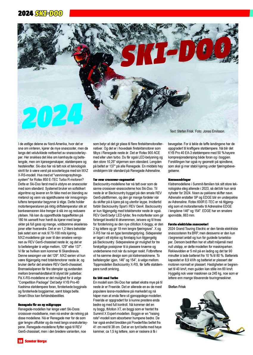Vi har også Elias Ishoels sesongsavslutt. Retro med konkurranse på Jan Rydningens minneløp og Alta Hillclimb. En Polaris S4 er bygget om i et prosjekt du kan lese mer om. I utgave er mer retro der Ski-Doos REV fyller 20 år i år. I 1994 kom Summmiten i grønt og vi skriver mer om det. NBAS har gått ut og anbefalt at du kjører på 98 oktan. I tillegg trekker Yamaha seg fra snøscootere.